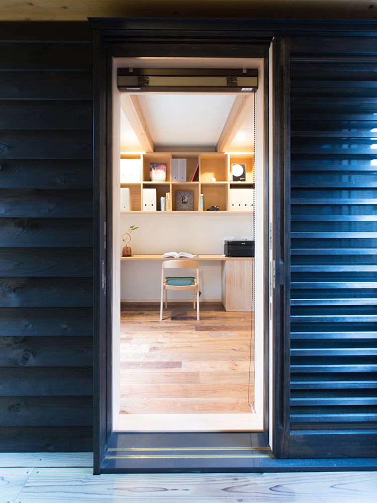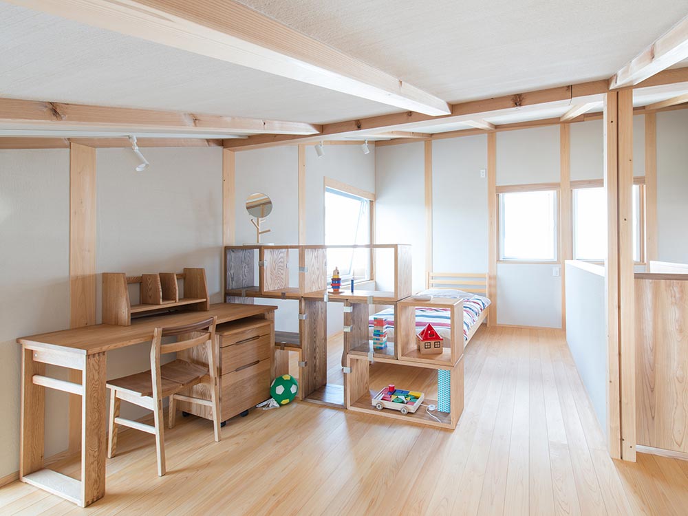 屋根裏を3階にした小ぶりな3階建て。住宅街の小さな土地でも敷地面積“しちぶんめ”、天井高“しちぶんめ”、家の高さ“しちぶんめ”にすることで生まれる余白が家の中に風を通し、陽を取り込むことができる。屋根裏を子供部屋にすることで1・2階をゆったりと家族が暮らせるスペースに。また天井が低いため視界が横長のパノラマになるので、狭さを感じさせない空間になっている。