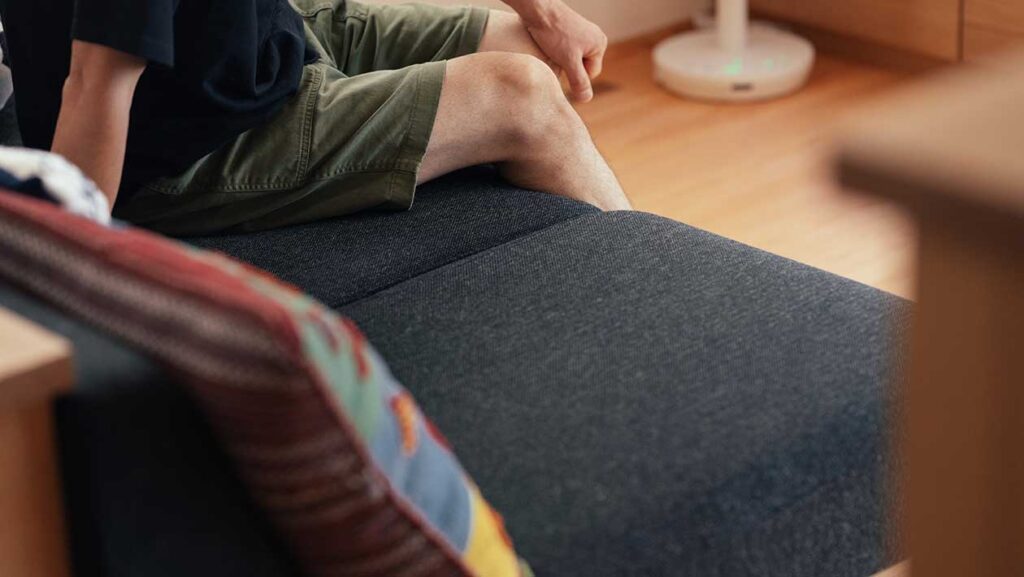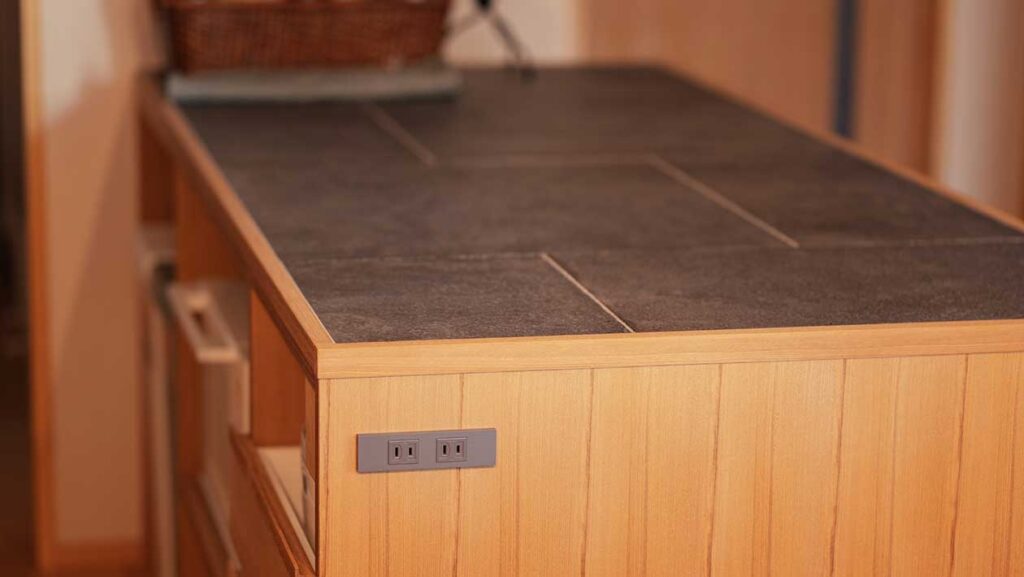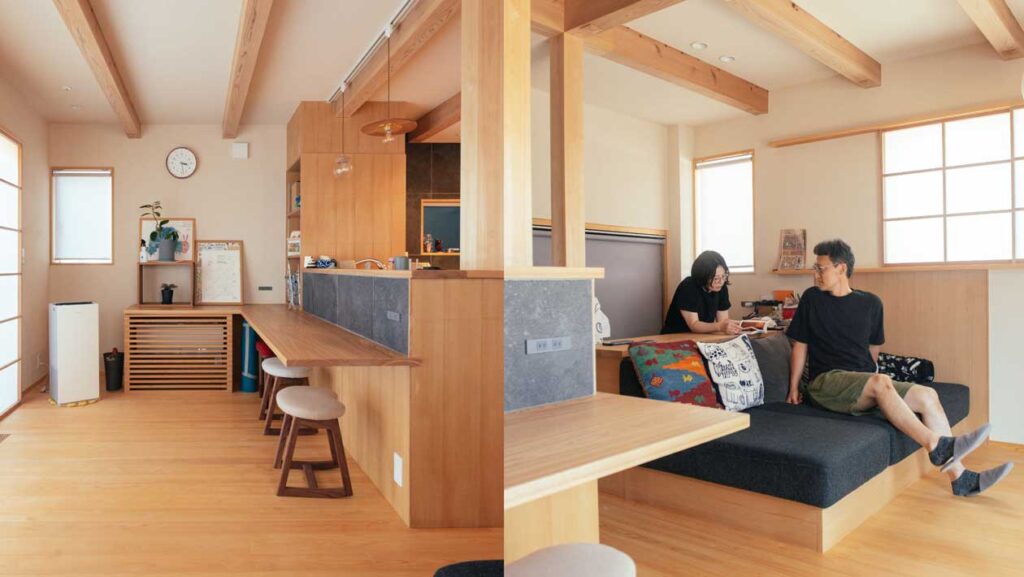 「特にお気に入りなのが、オリジナルでつくってもらったソファ。このソファに座ってテレビでスポー ツ観戦するのが楽しみなんですよ」 造作のソファは足を伸ばせる長さでおつくりした。足を伸ばしてテレビを見たり、読書をしたり、眠 くなったらうとうとするのもいい。ソファ、カウンターなど、この家には二人の居場所がたくさんある。